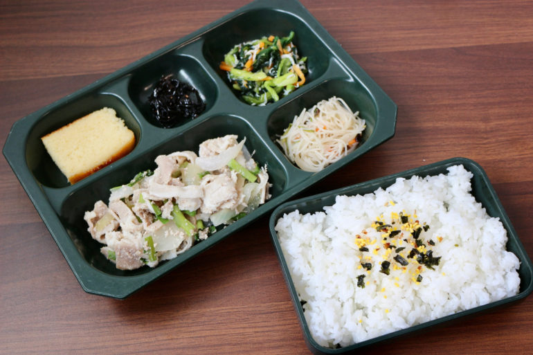 今日は食べやすい大きさに切り、鶏ガラとごま油も加え味付けした葱塩豚炒めと、じゃこ小松菜和え物、ビーフン、佃煮のお弁当です!