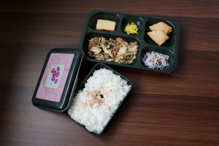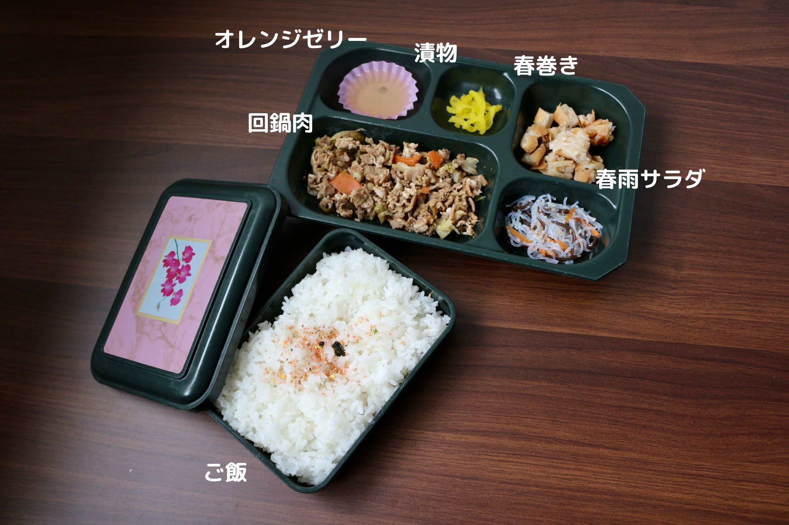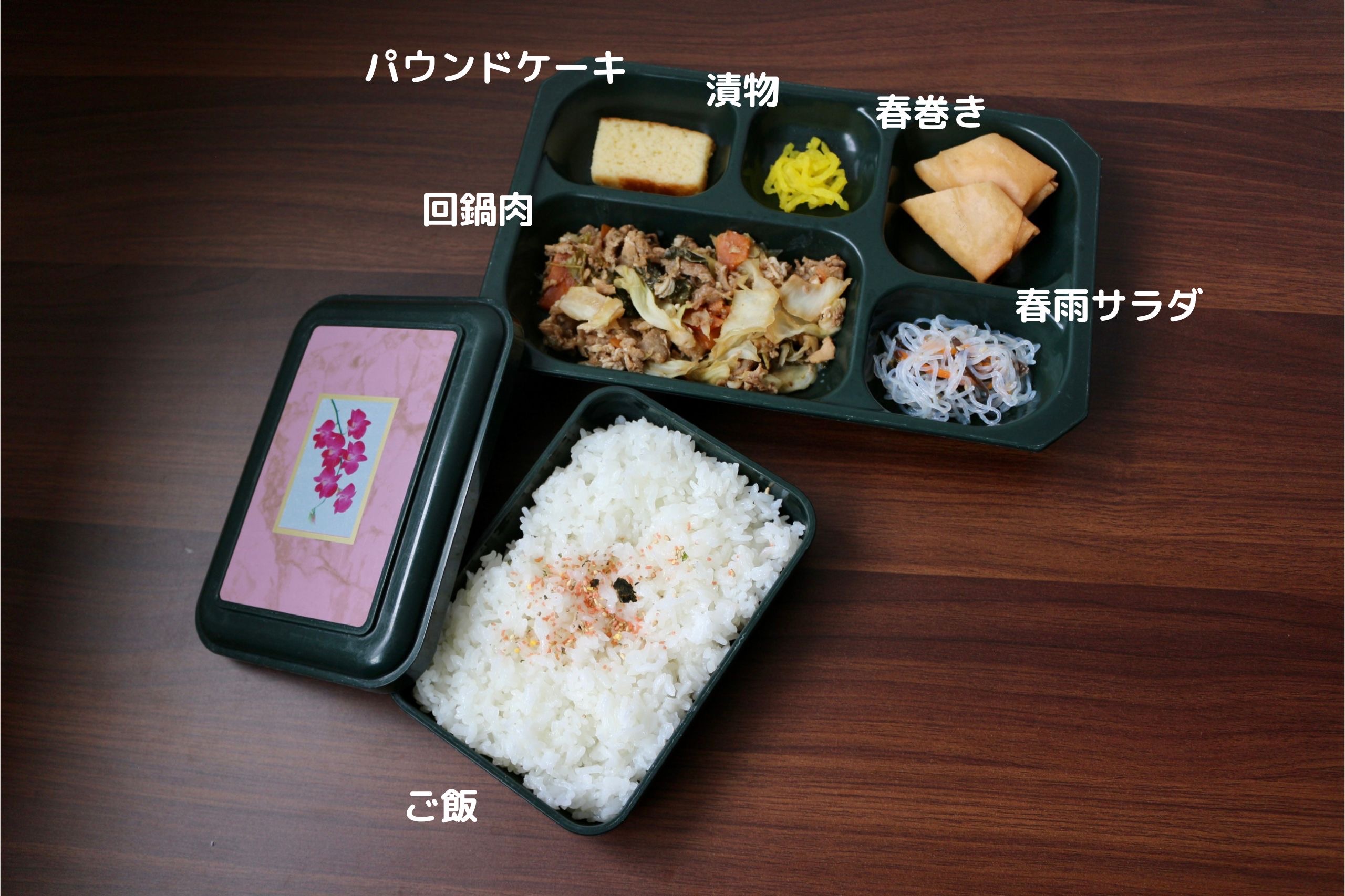 今日は回鍋肉、春巻き、春雨サラダ、漬物、ご飯が入った中華風のお弁当です!