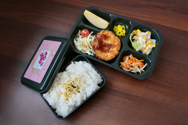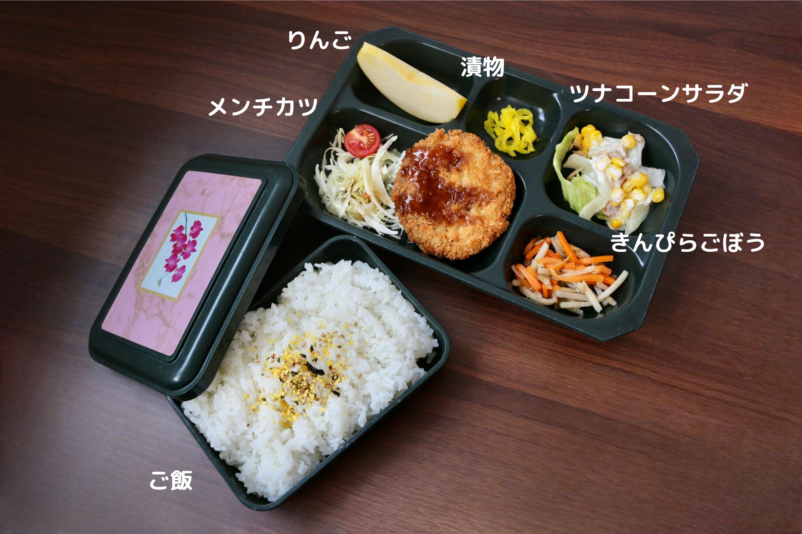 今日はメンチカツ、ツナコーンサラダ、きんぴらごぼう、漬物、ご飯のお弁当です!