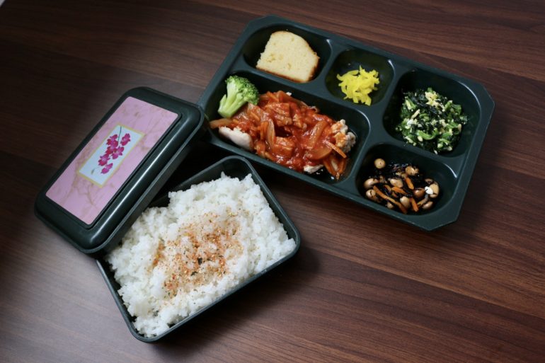 今日は鶏のトマトソース煮、ほうれん草錦糸和え、ひじき煮、漬物、ご飯のお弁当です!