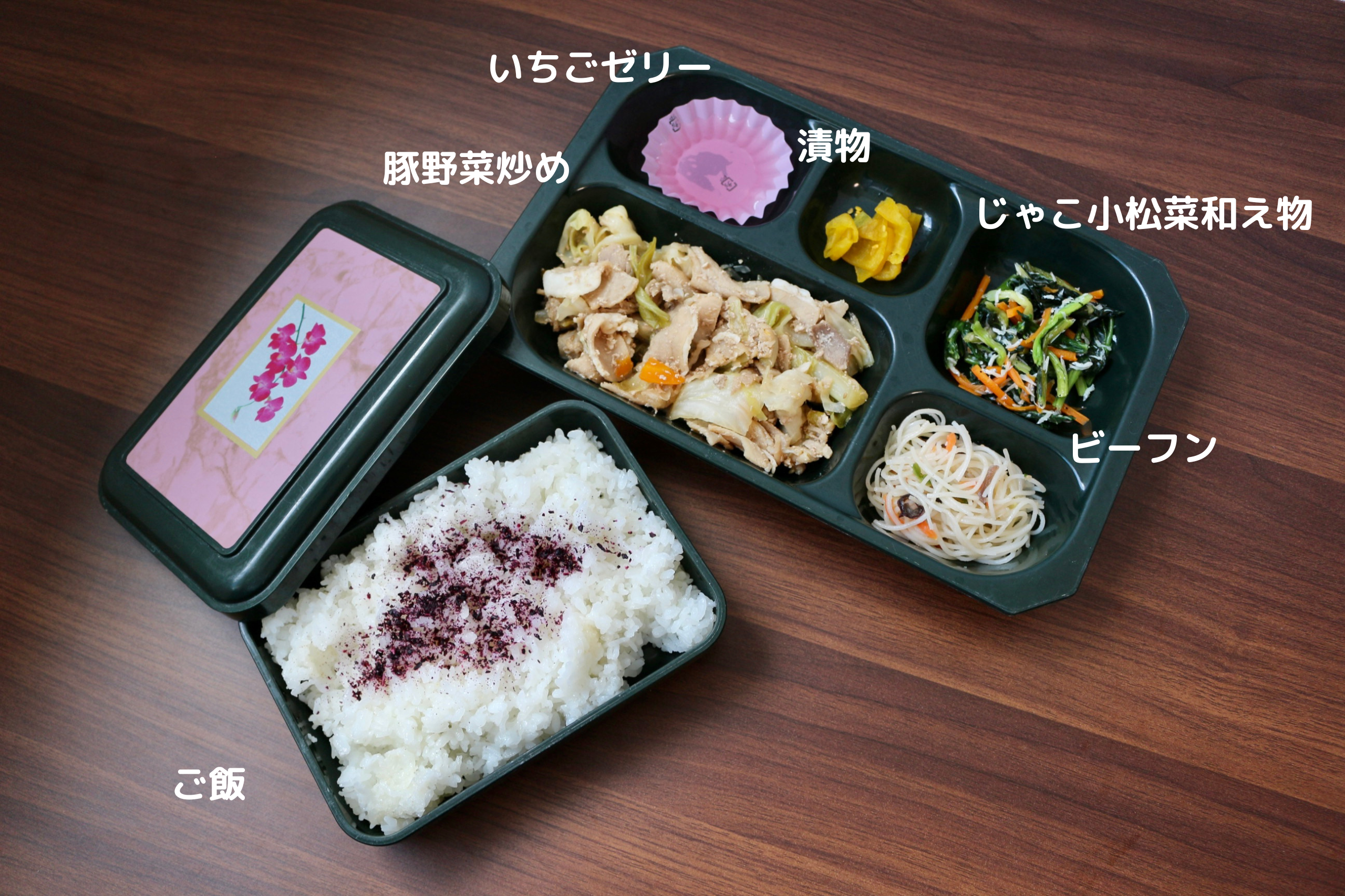 今日は豚野菜炒め、じゃこ小松菜和え物、ビーフン、漬物、ご飯のお弁当です!