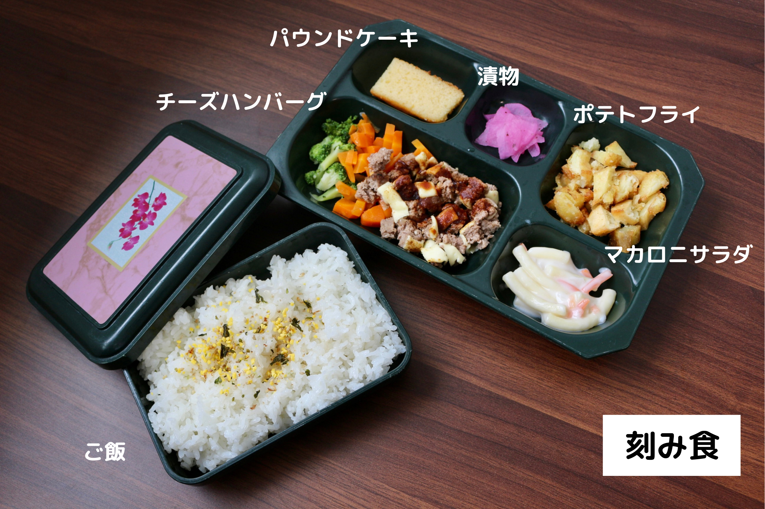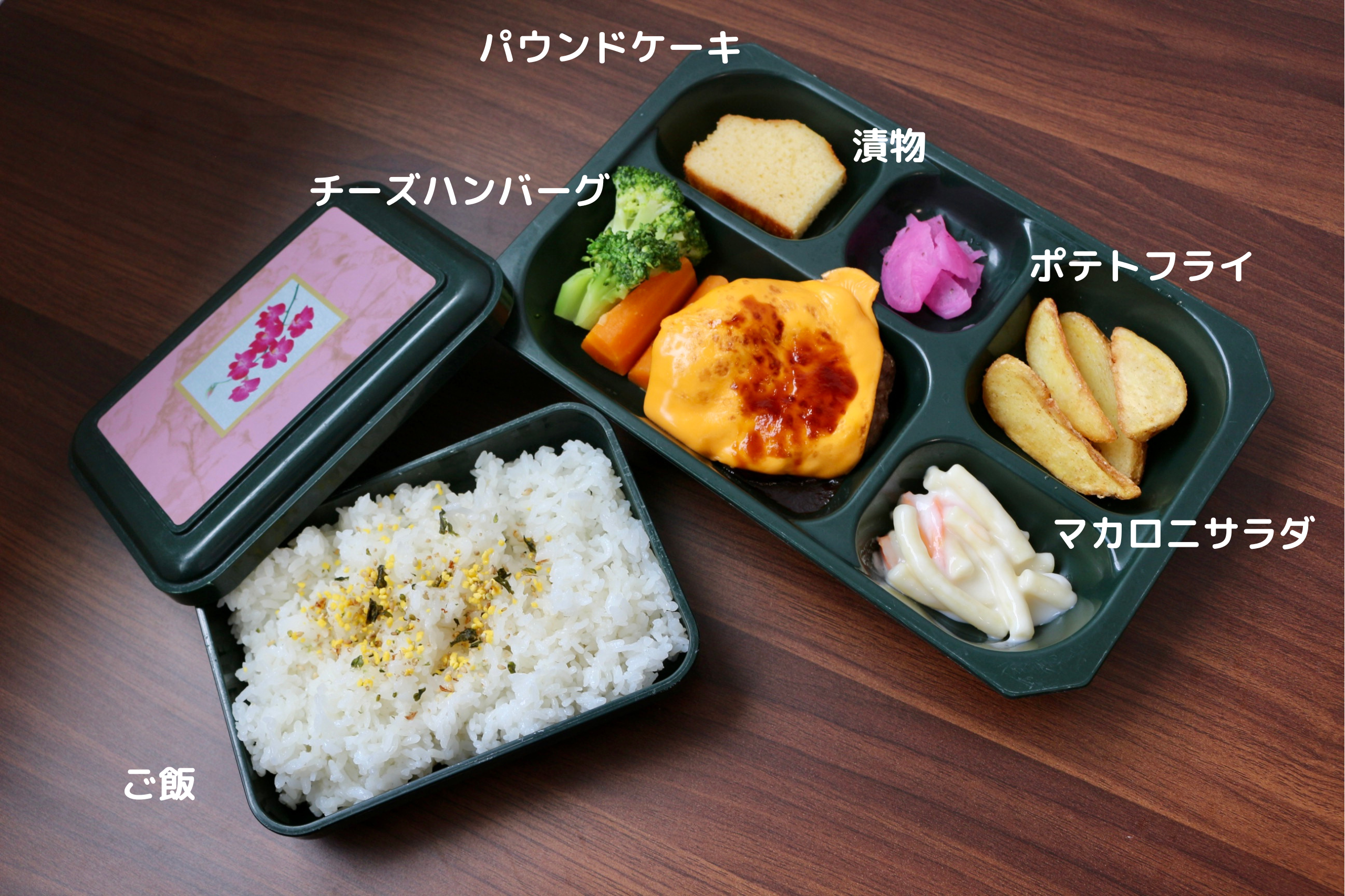 今日はチーズハンバーグ、ポテトフライ、マカロニサラダ、漬物、ご飯のお弁当です!