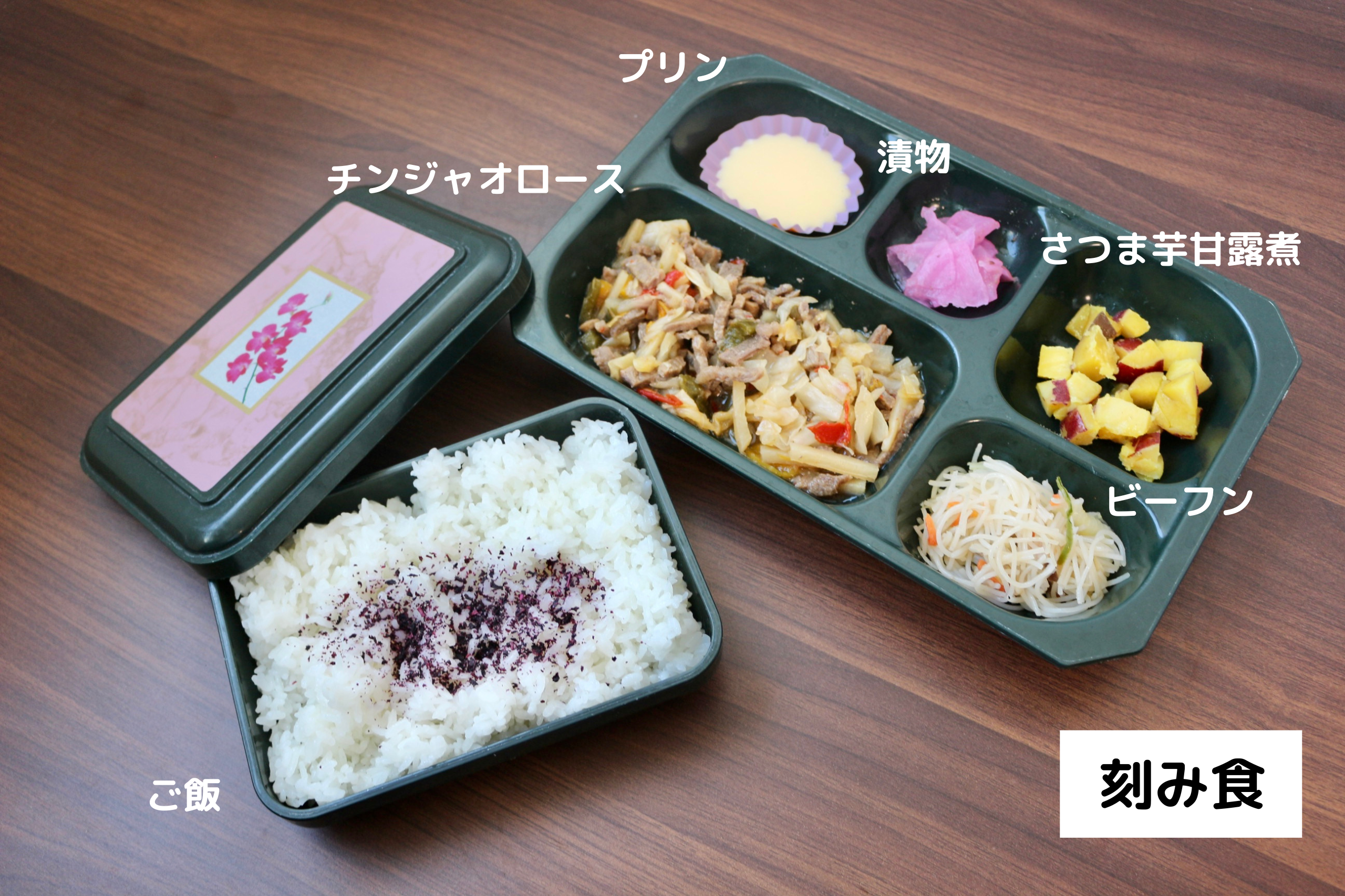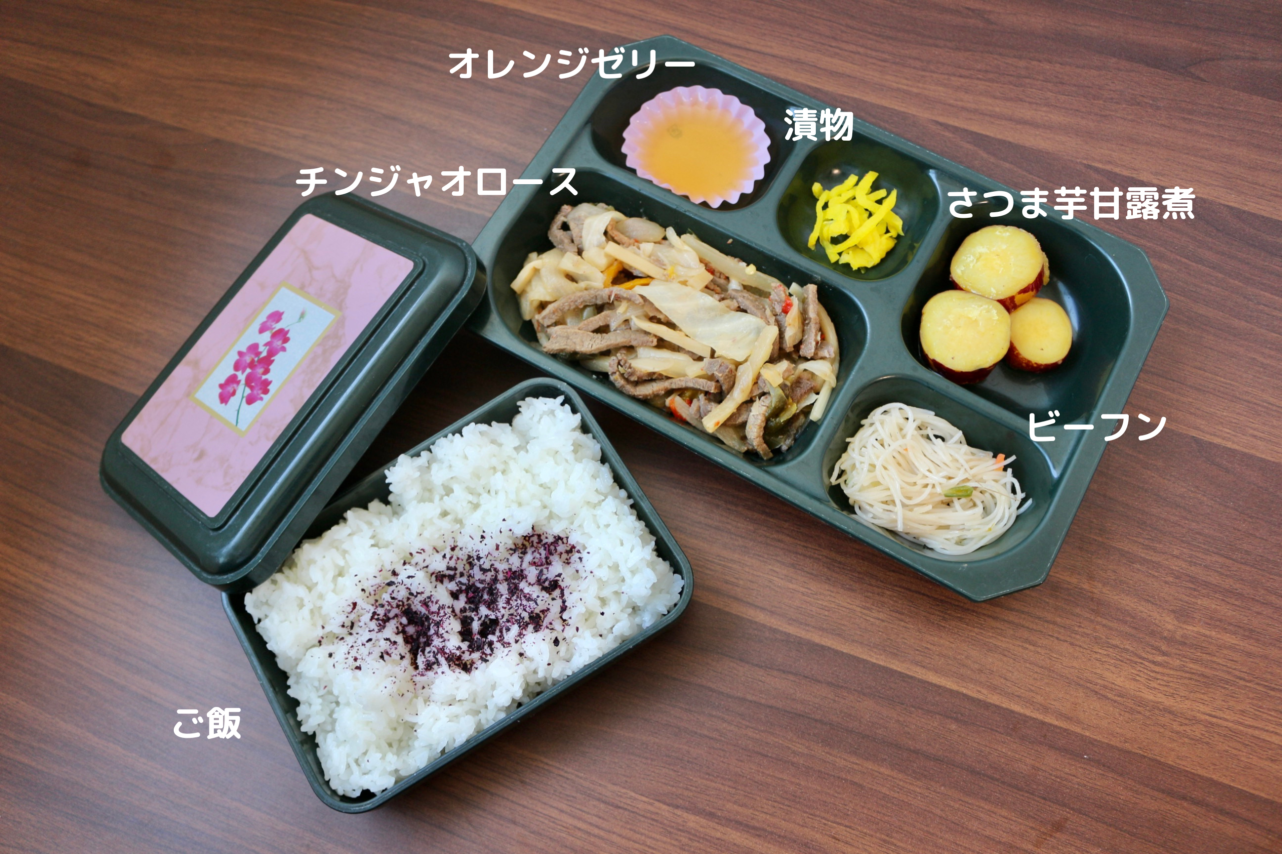 今日はチンジャオロース、さつま芋甘露煮、ビーフン、漬物、ご飯のお弁当です!