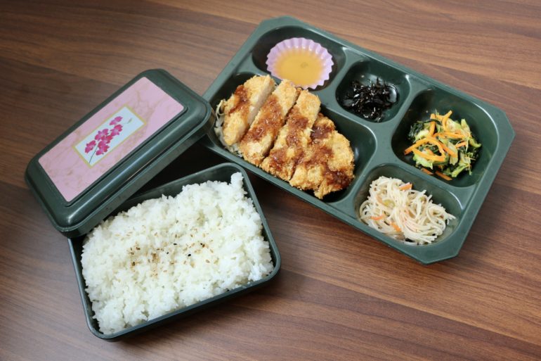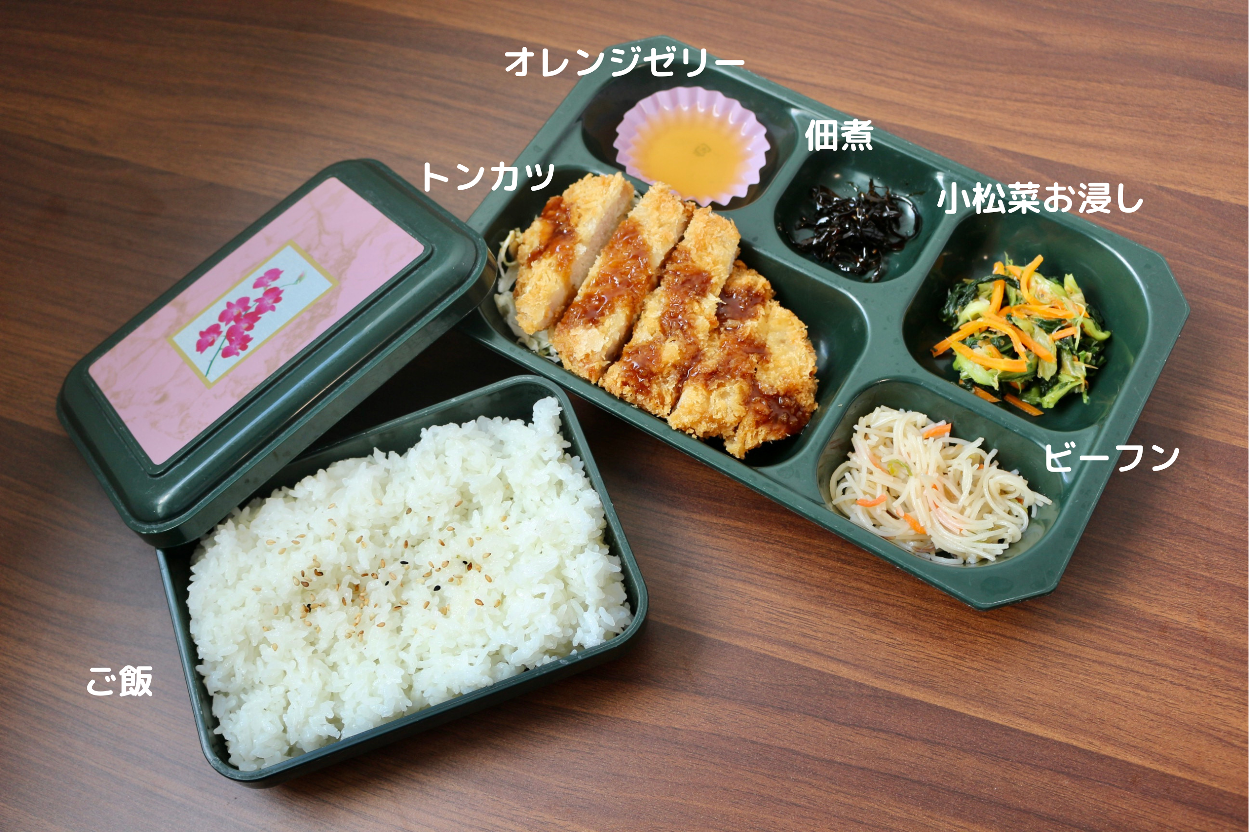 今日はトンカツ、小松菜お浸し、ビーフン、佃煮、ご飯のお弁当です!