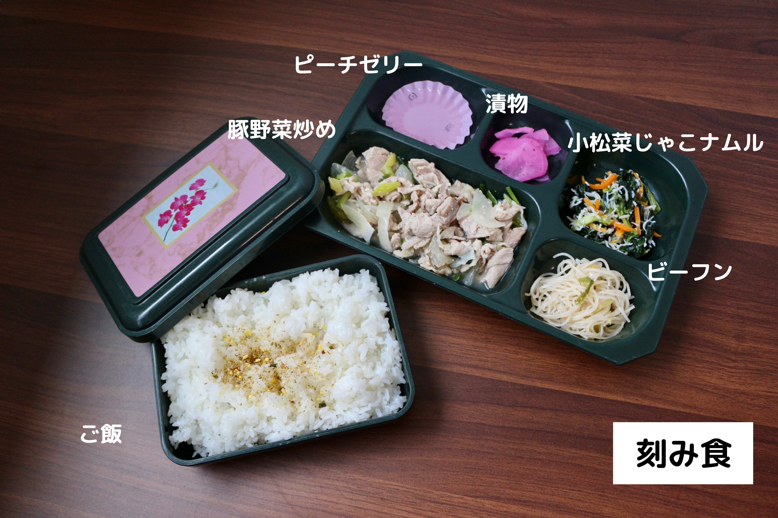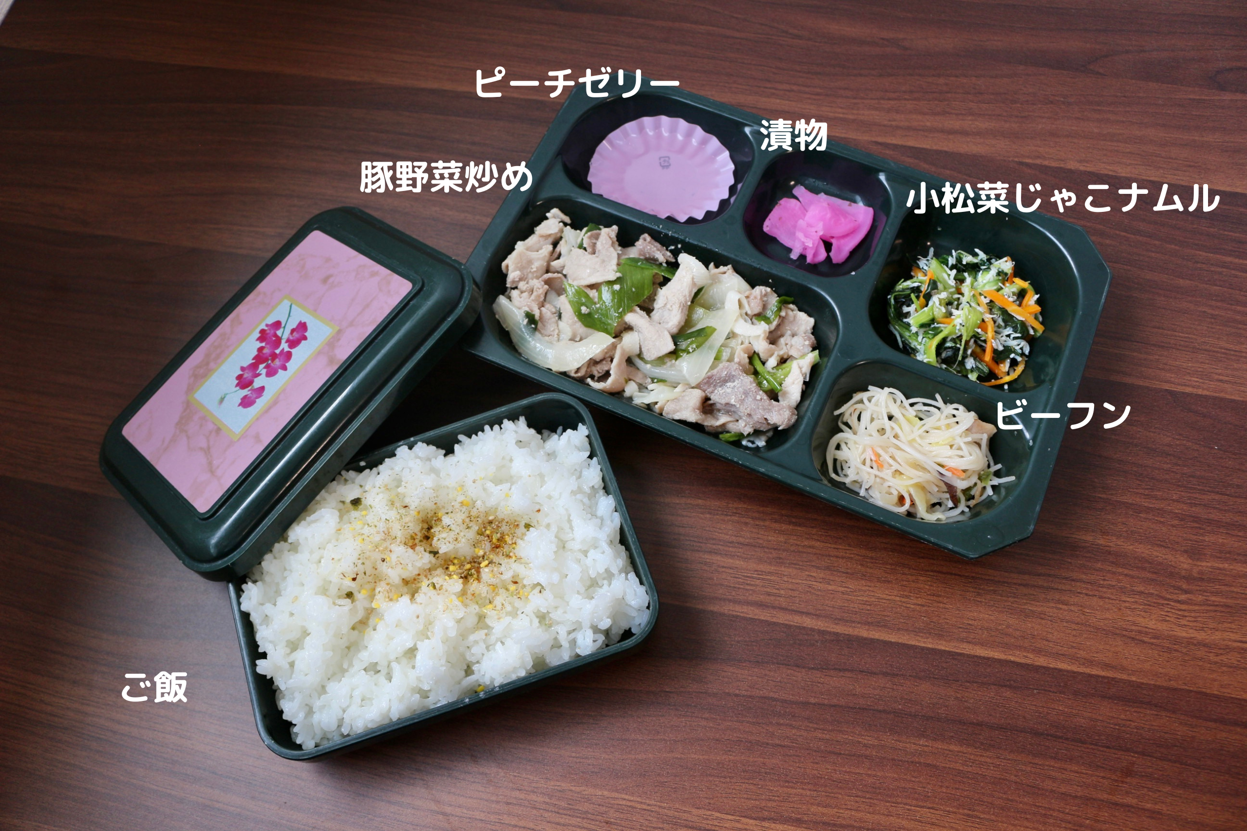 今日は豚野菜炒め、小松菜じゃこナムル、ビーフン、漬物、ご飯のお弁当です!