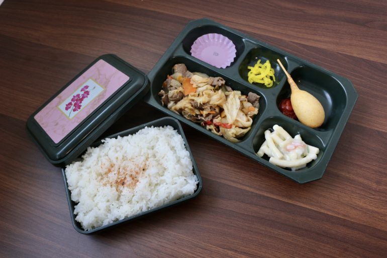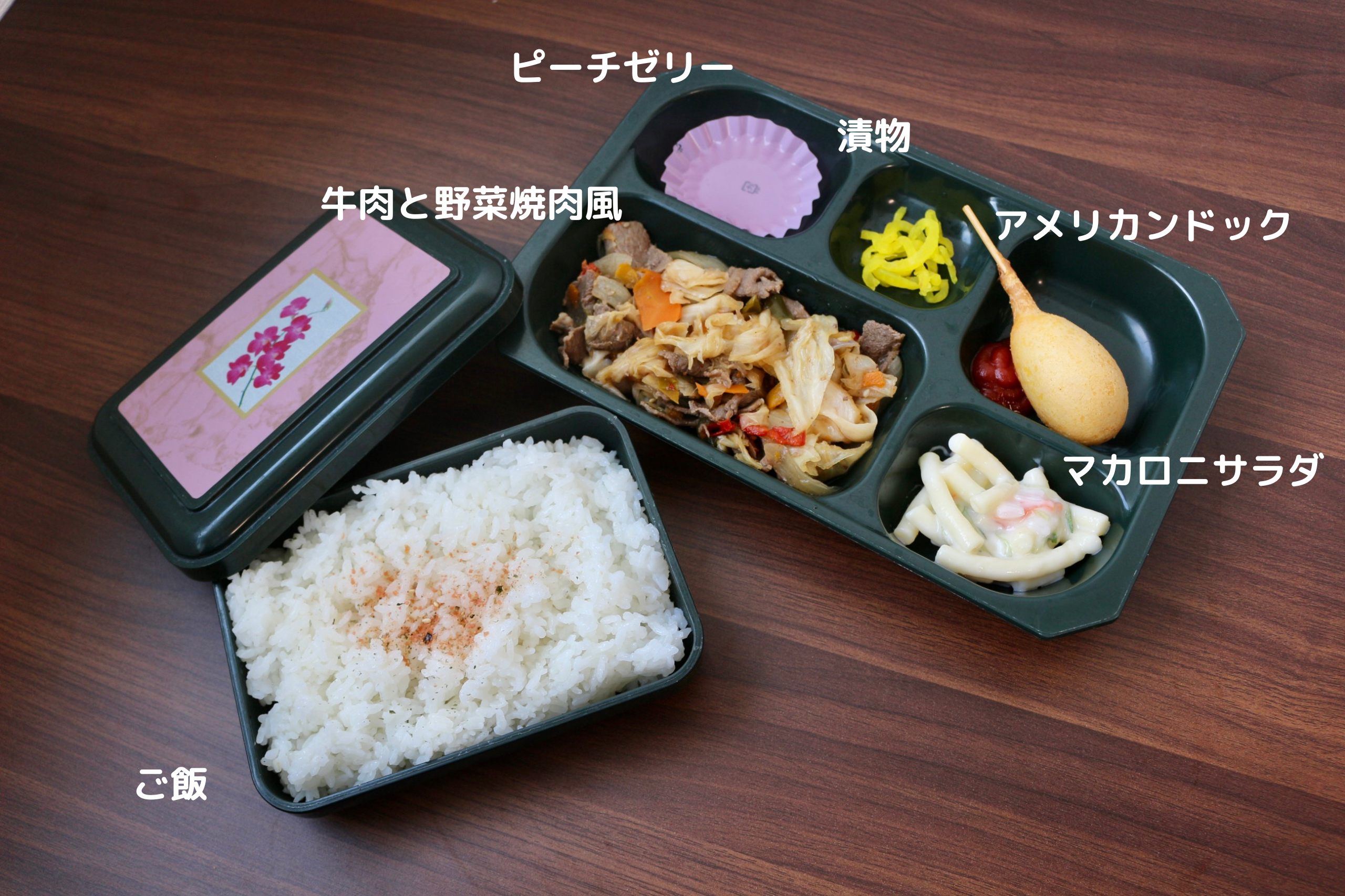 今日は牛肉と野菜焼肉風、アメリカンドック、マカロニサラダ、漬物、ご飯のお弁当です!