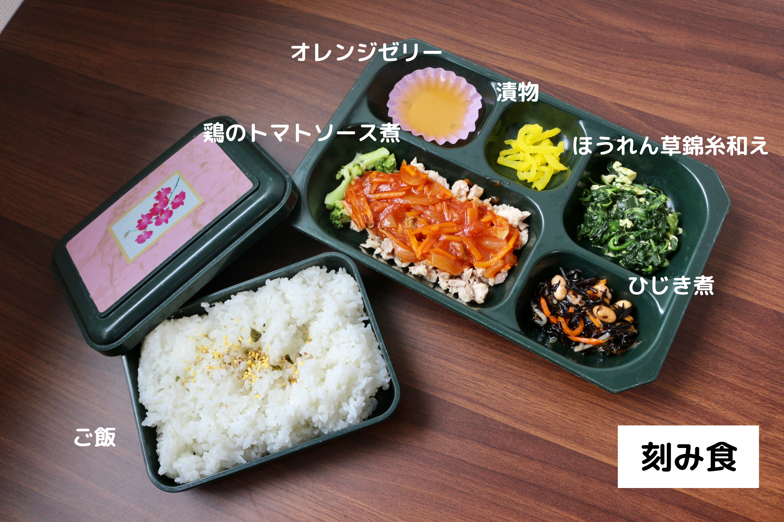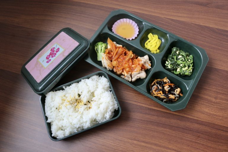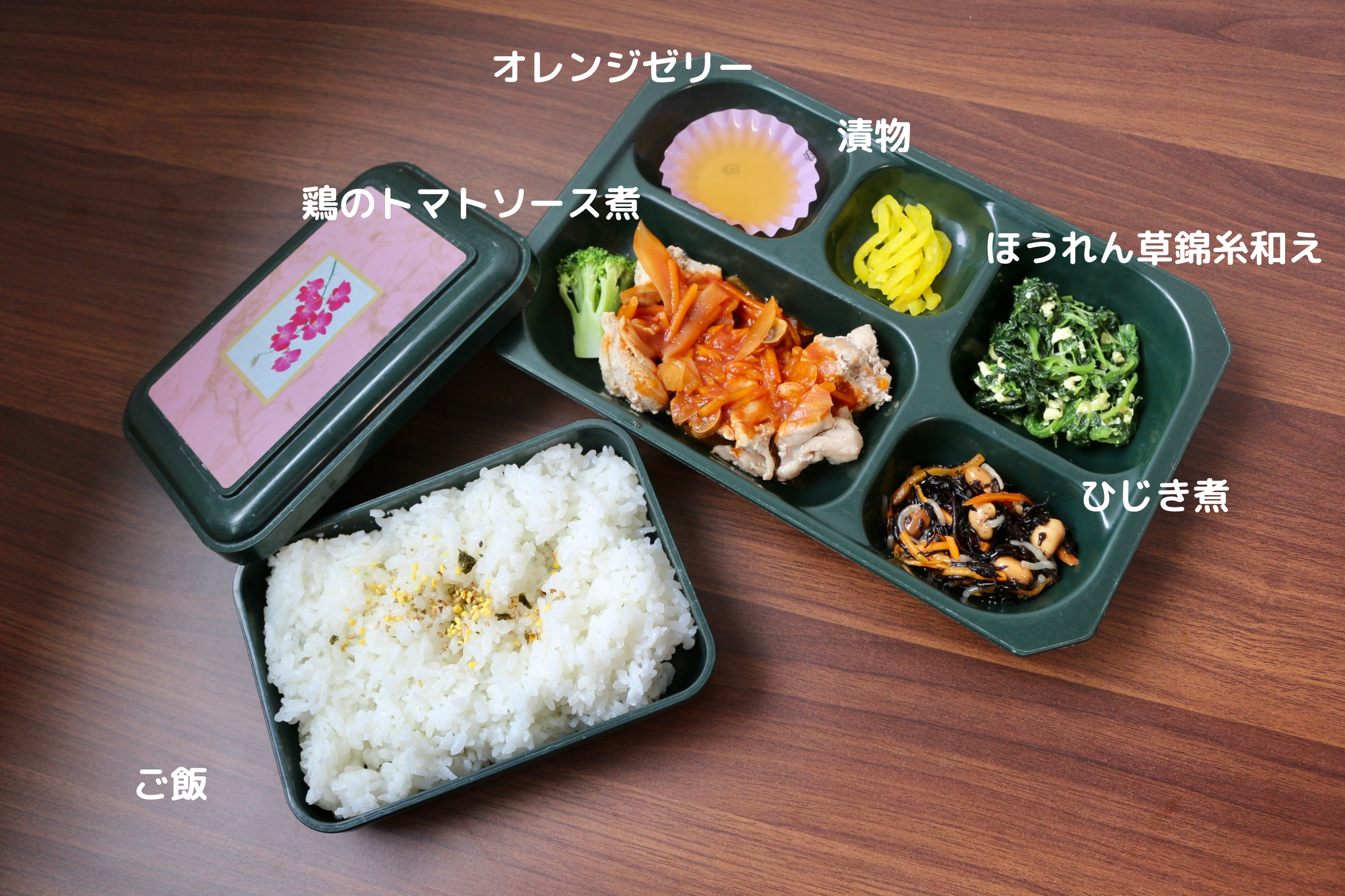 今日は鶏のトマトソース煮、ほうれん草錦糸和え、ひじき煮、漬物、ご飯のお弁当です。