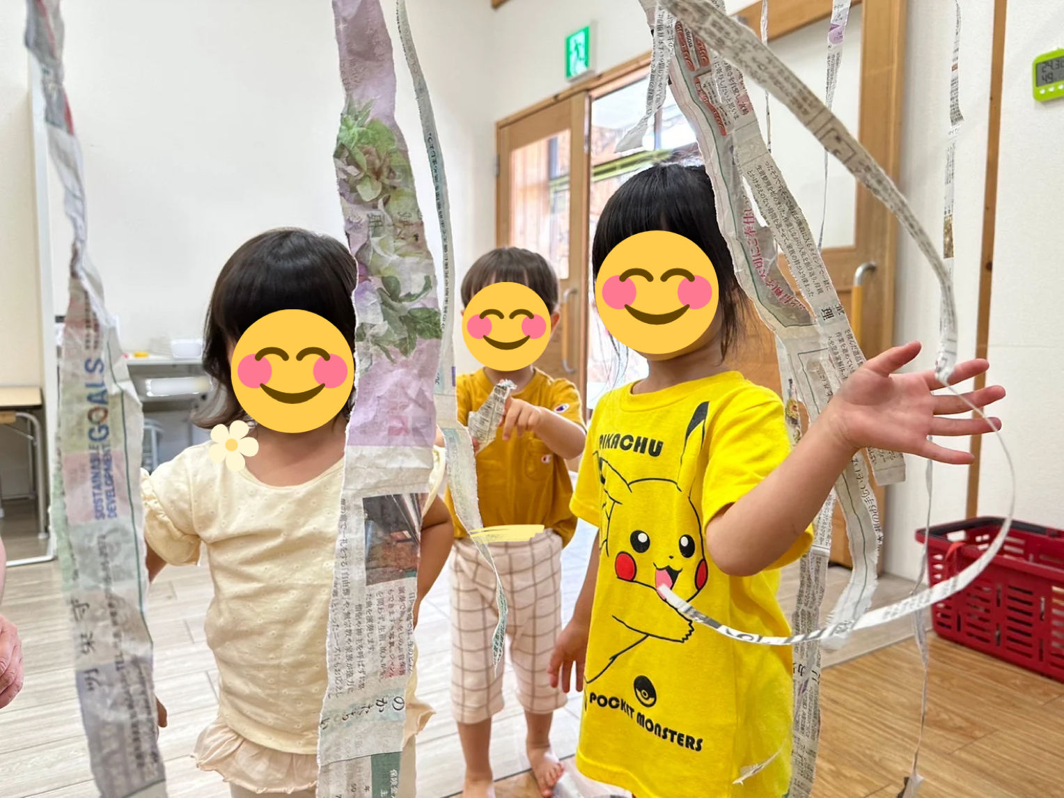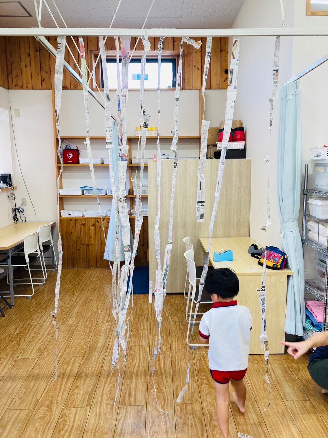 長くちぎった新聞紙を、のれんのように吊るすお手伝いをしたり、吊るした物の下をくぐったり…