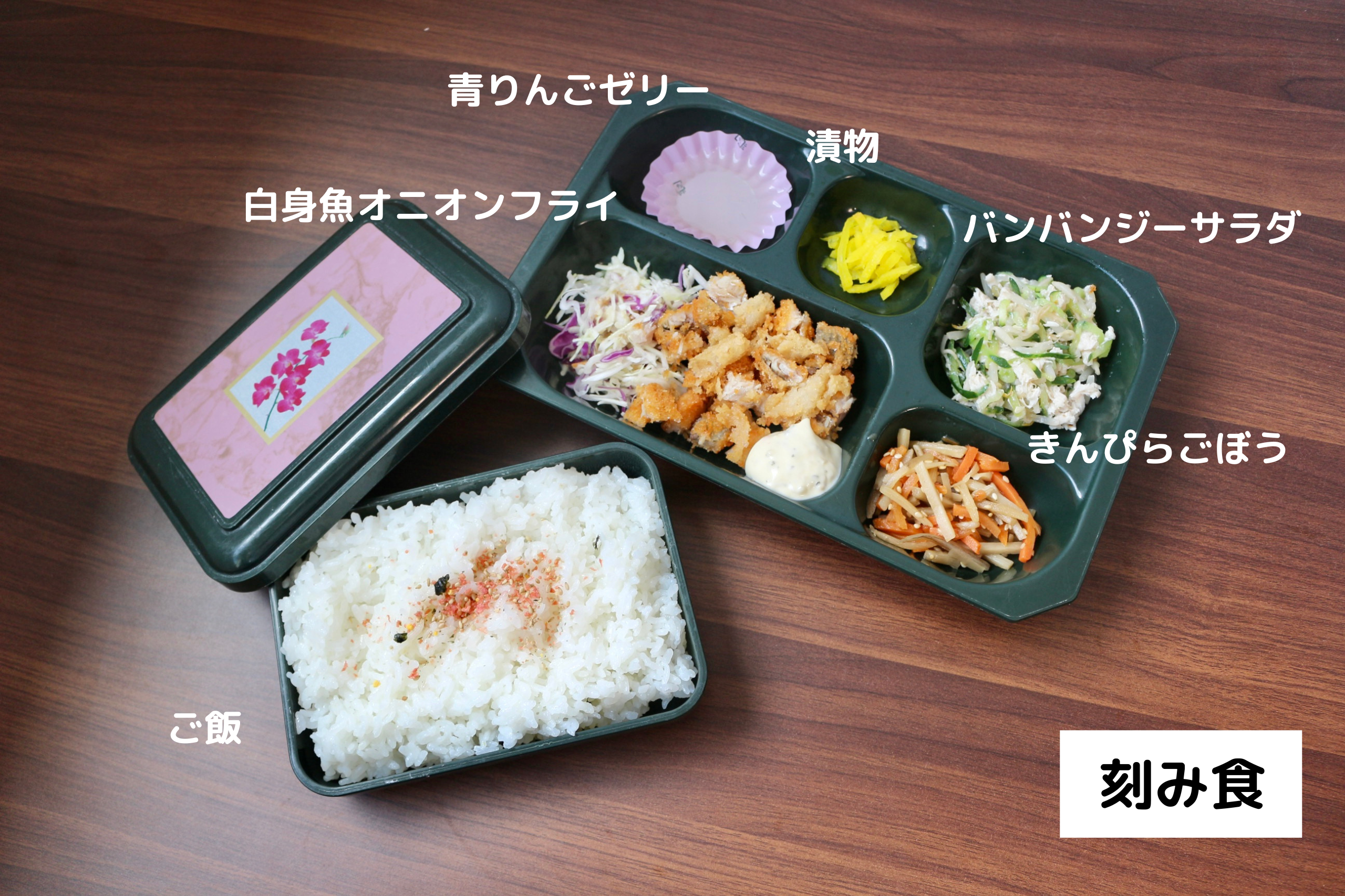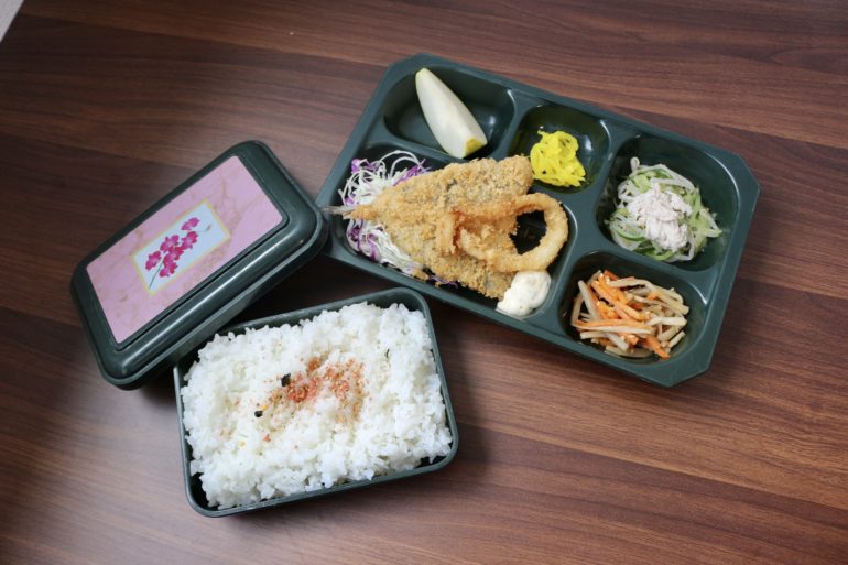 今日は白身魚オニオンフライ、バンバンジーサラダ、きんぴらごぼう、漬物、ご飯のお弁当です。