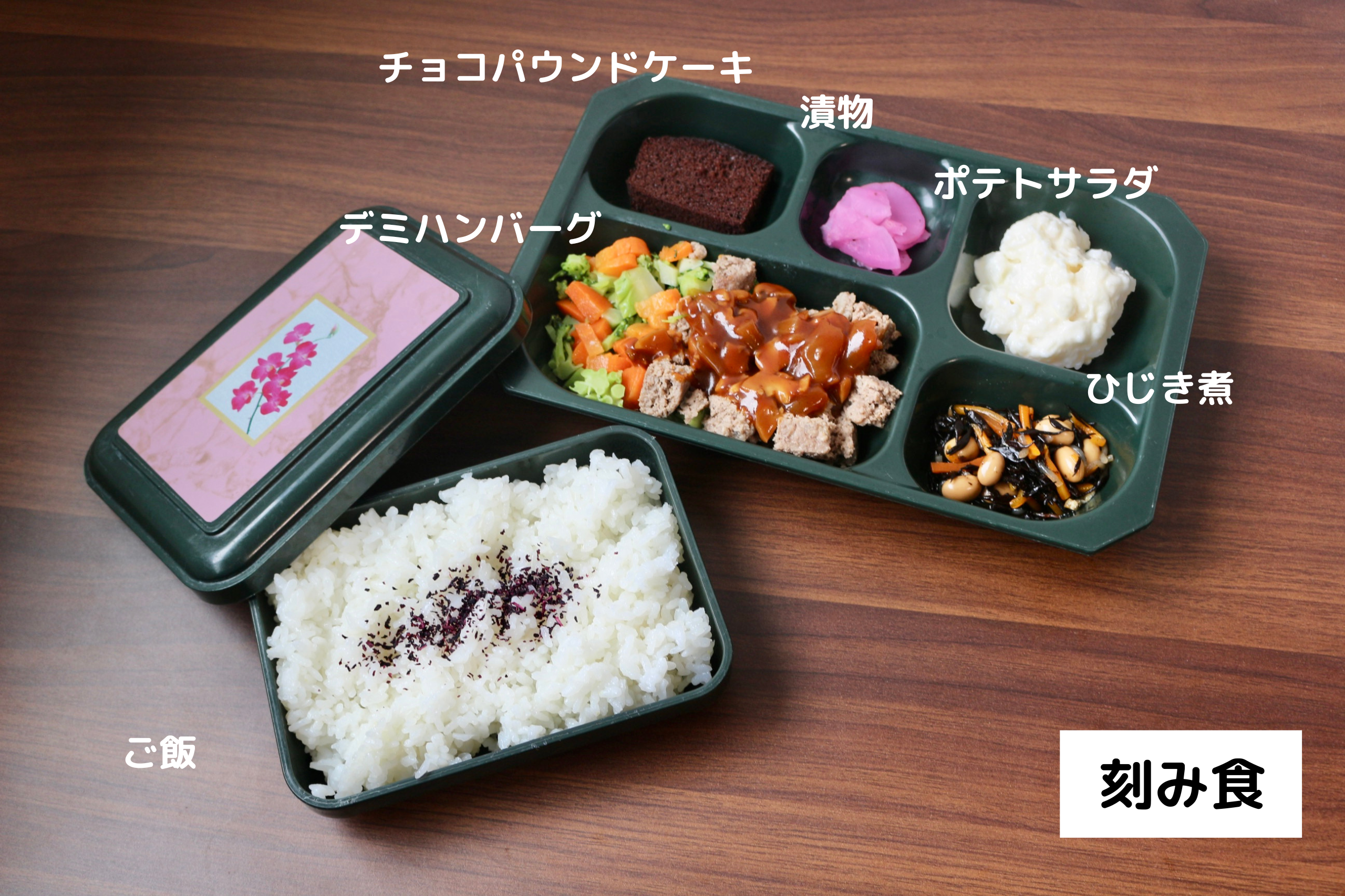 今日はデミハンバーグ、ポテトサラダ、ひじき煮、漬物、ご飯のお弁当です。
