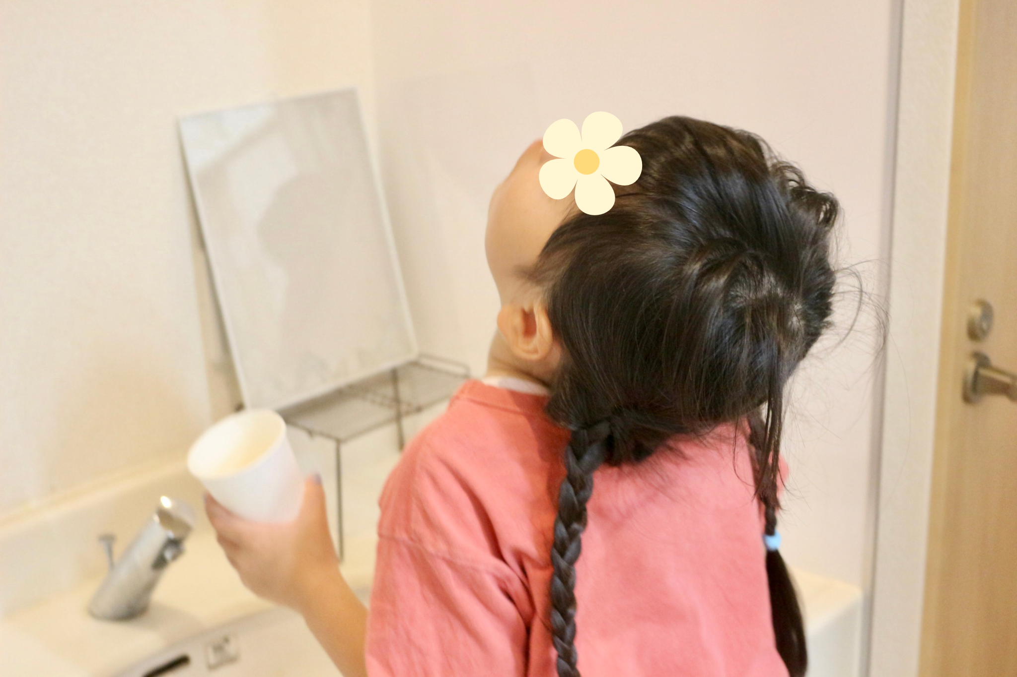 食べ終えたら舌をしっかり動かして口の中をきれいにした後、ガラガラうがいをしました(口と舌の運動)