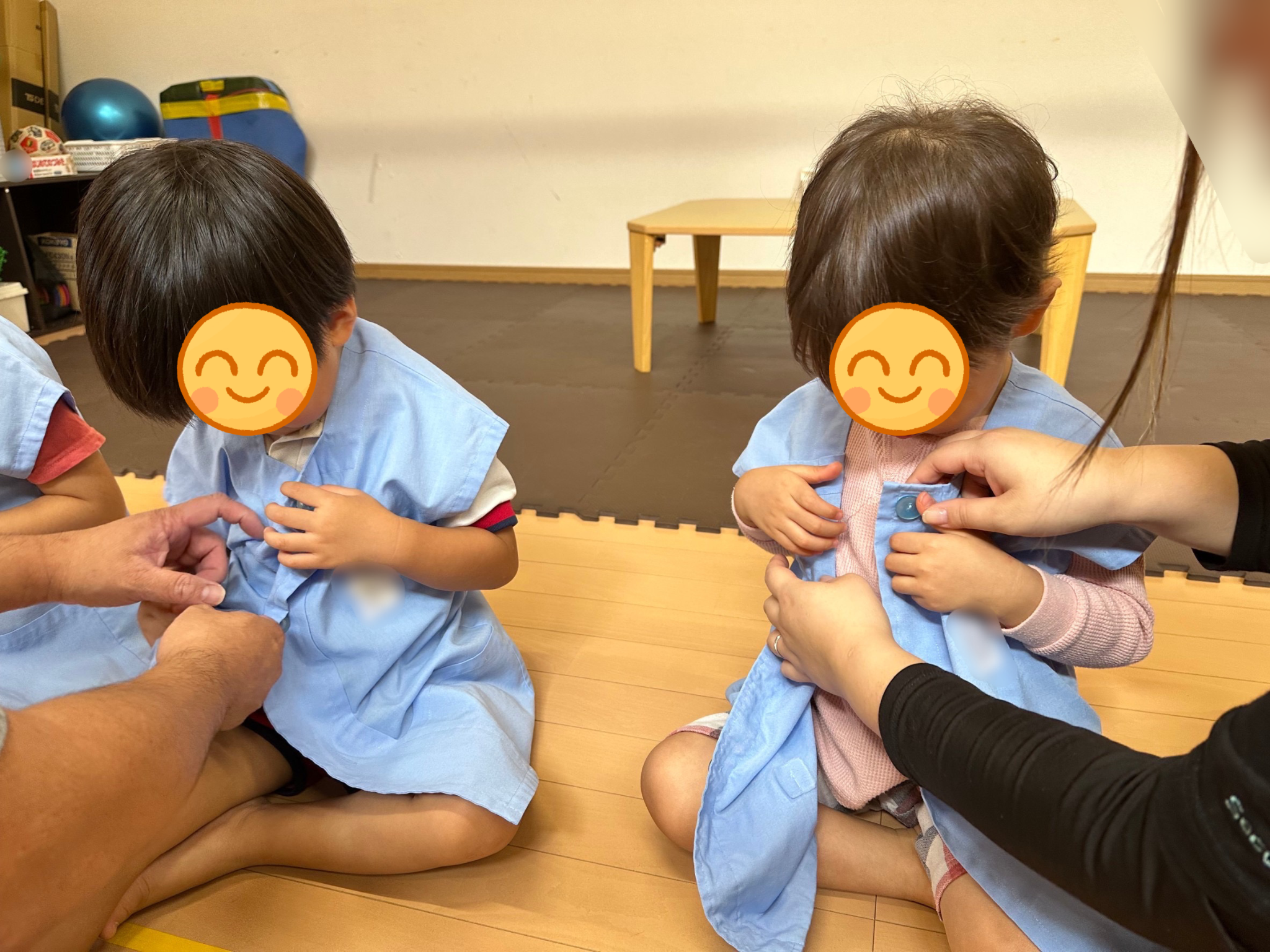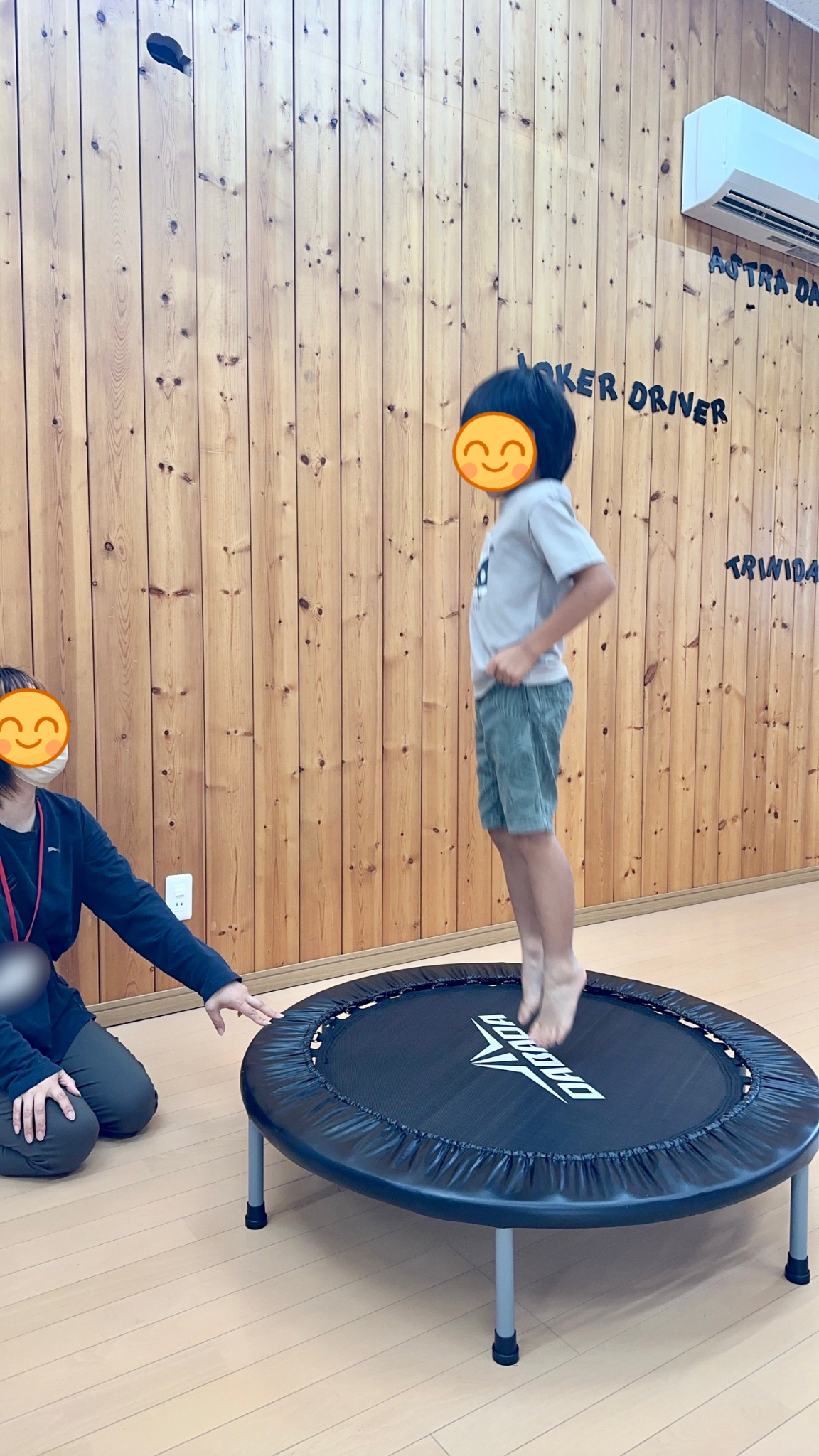 その後、それぞれ小集団に分かれ、100まで数えながらトランポリンを飛んだり、ボタンつけなど日常動作の練習をしました。
