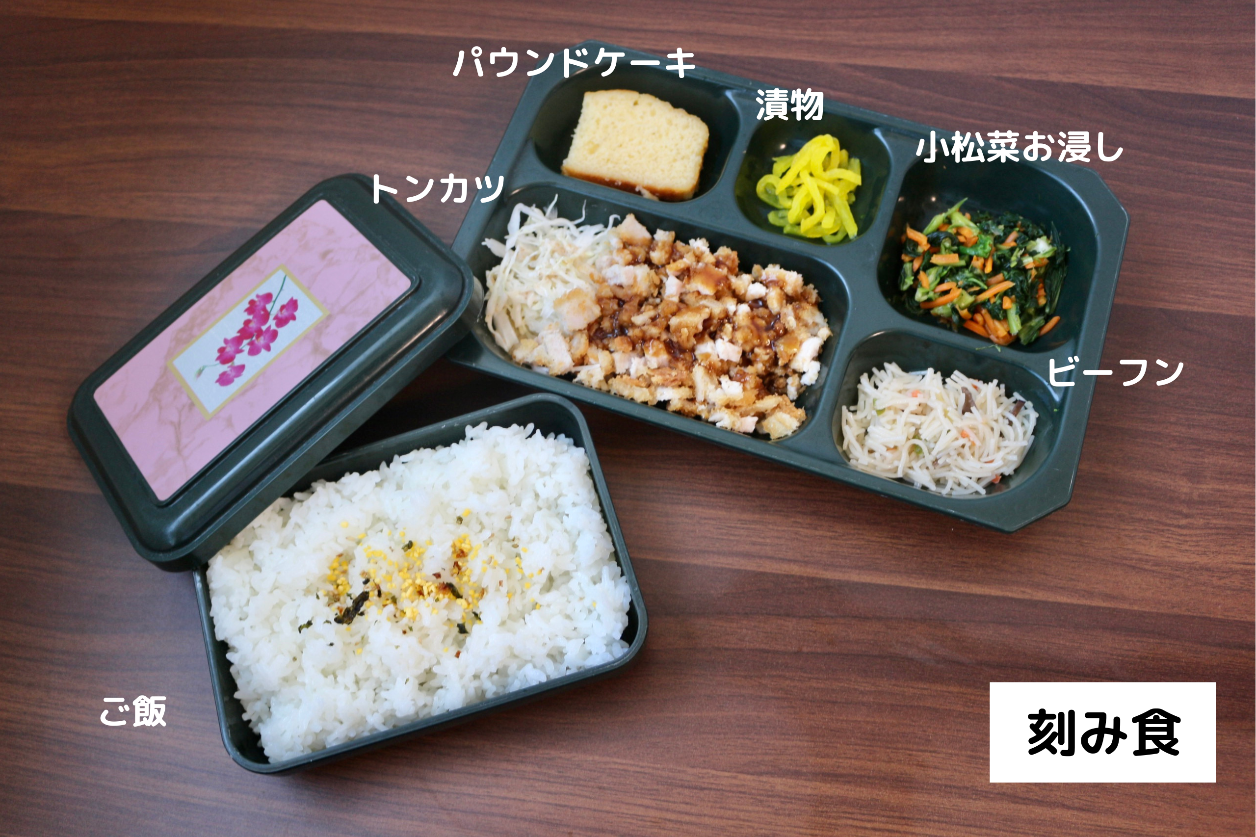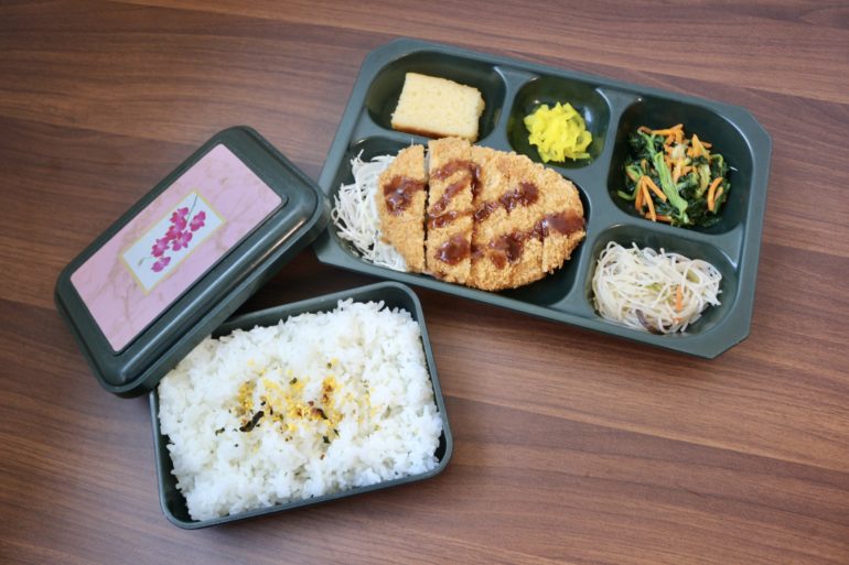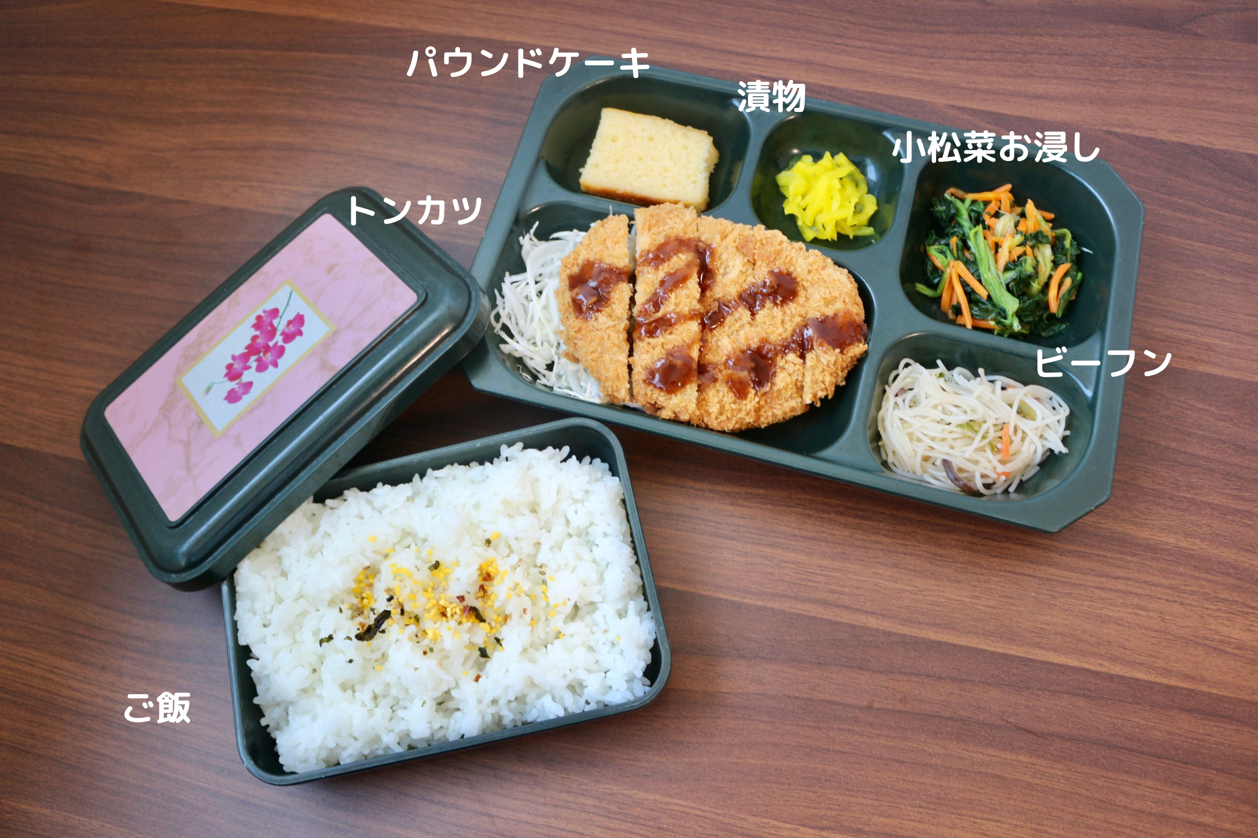 今日はトンカツ、小松菜お浸し、ビーフン、漬物、ご飯のお弁当です。