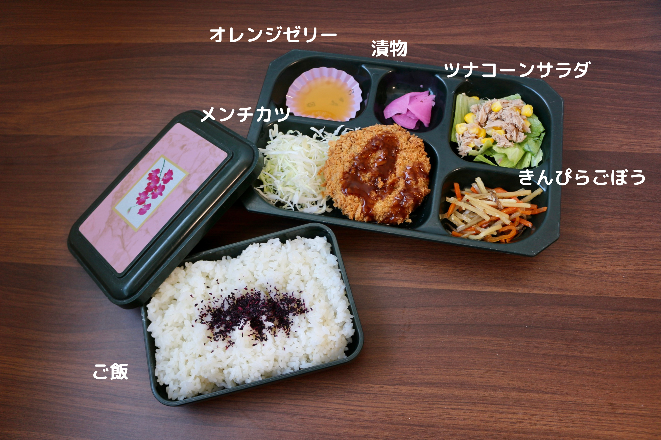 今日はメンチカツ、ツナコーンサラダ、きんぴらごぼう、漬物、ご飯のお弁当です。