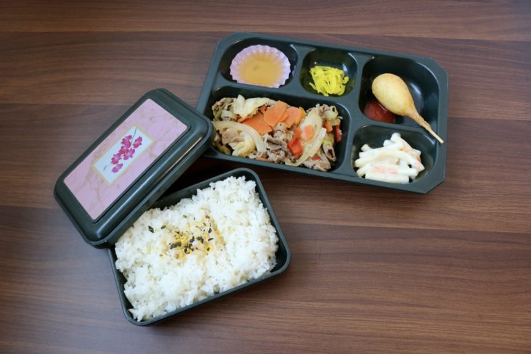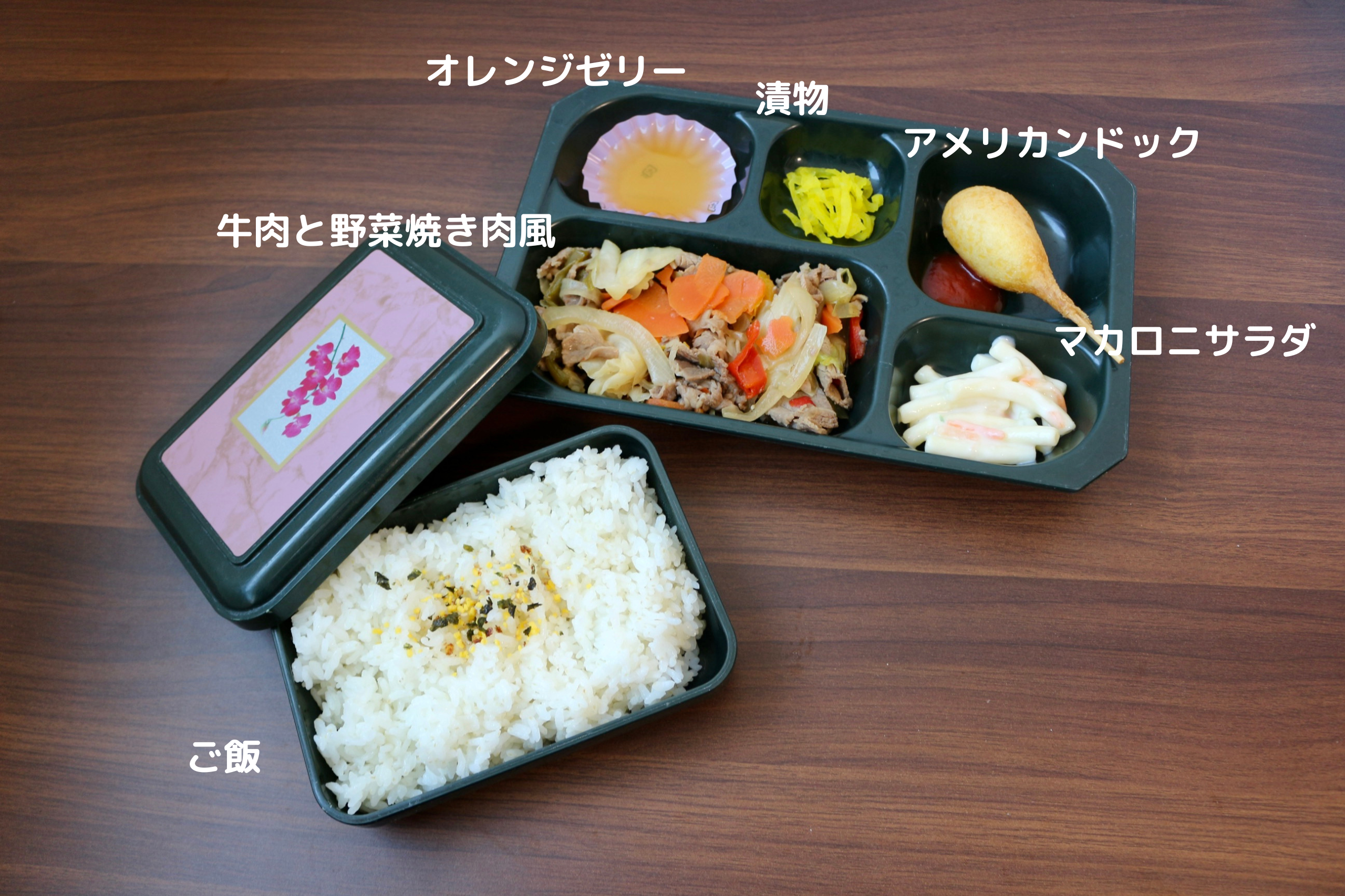 今日は牛肉と野菜焼き肉風、アメリカンドック、マカロニサラダ、漬物、ご飯のお弁当です。