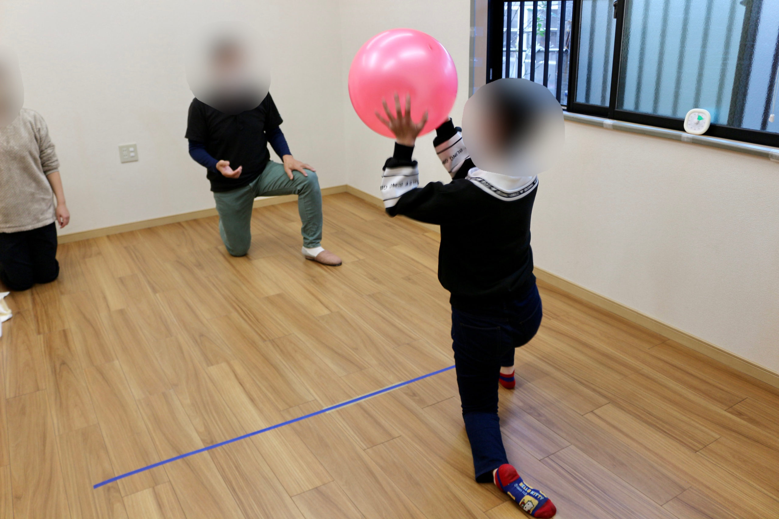 ボールを使って遊びながら、下肢の筋力、柔軟性、協調性を向上させます。